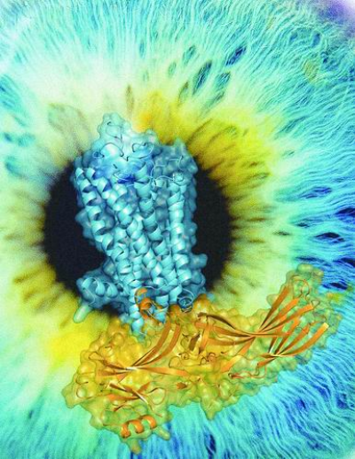 徐華強領銜的國際合作團隊首次解析了視紫紅質與阻遏蛋白完整復合物的晶體結構。圖中藍色所示為視紫紅質的結構,黃色所示為阻遏蛋白的結構。上海藥物所供圖