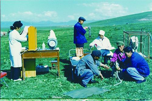 1985年,海北站科研人員在野外測定綿羊呼吸對高原草甸碳排放的影響。西北高原所供圖
