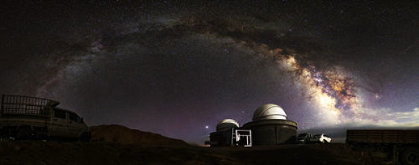 2021年“七夕”的銀河拱門,拍攝于施工中的賽什騰C點,中國科學技術大學的2.5米巡天望遠鏡、中科院國家天文臺的1米SONG望遠鏡、西華師范大學的50BiN雙筒望遠鏡、中科院地質與地球物理研究所的1.8米和80厘米行星觀測望遠鏡均建于這個平臺。
