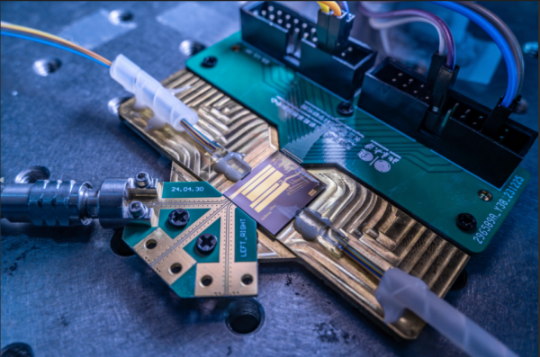 研究團隊制備的超寬帶光電融合芯片。北京大學供圖