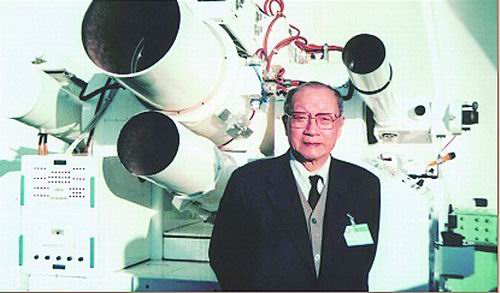 1994年,王大珩在大型電影經緯儀前留影。長春分院供圖